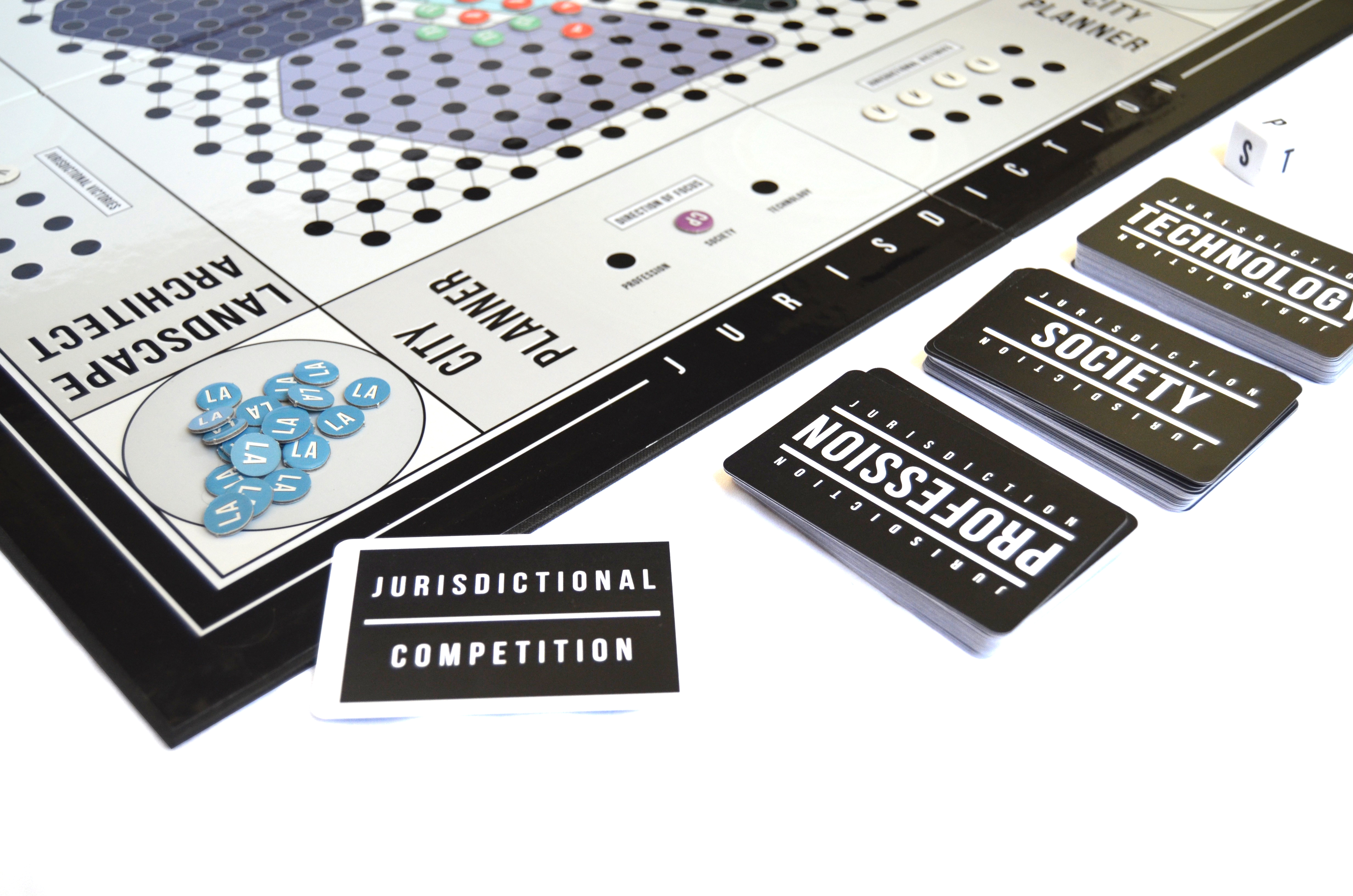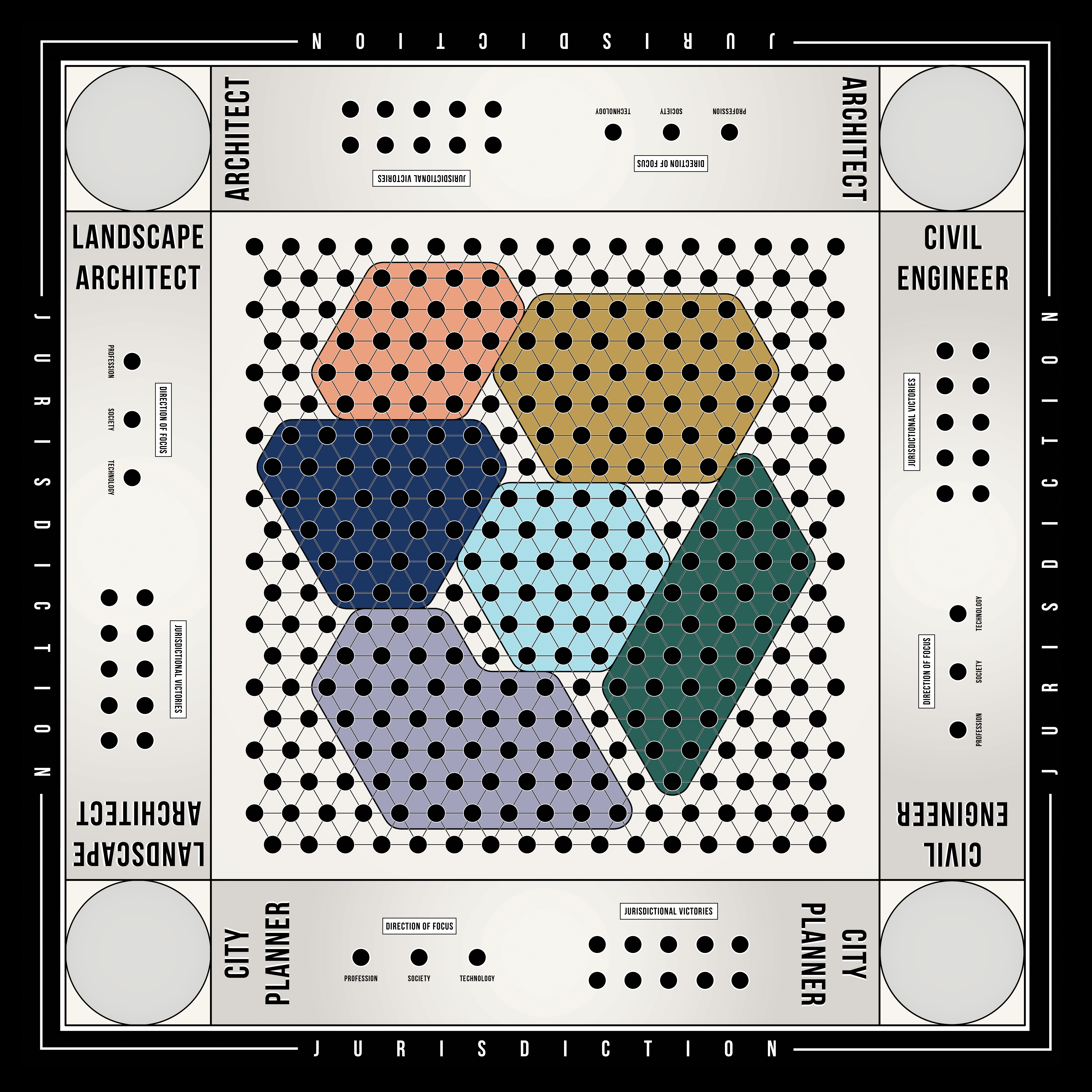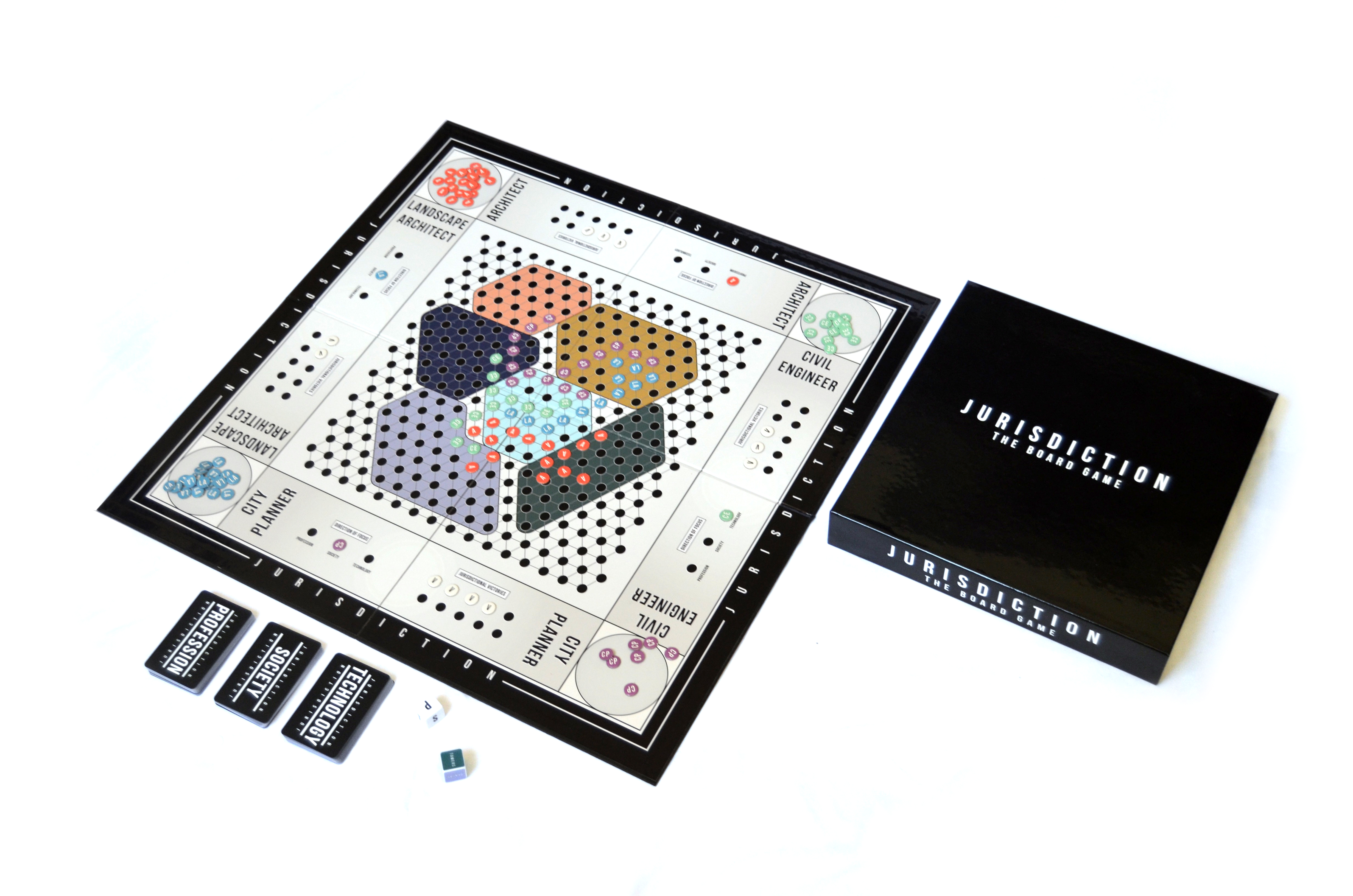 Most histories of architecture are written as if the disciplines of civil engineering, landscape architecture, and city planning simply do not exist. Within these texts, architects are portrayed as versatile heroes who not only design buildings, but also cities, infrastructures, and landscapes. Rarely is any serious attention devoted to the interactions between architects and their counterparts in allied disciplines. Recent sociological research, however, suggests that professions do not develop independently, but are instead shaped by jurisdictional conflicts with competitors. Jurisdiction: The Board Game presents a playable model of inter-professional competition. Structured around six territories (housing, towers, parks, plazas, streets, and gardens), the game requires players to adopt a profession and reconfigure its disciplinary boundaries in order to compete for jurisdictional victories. Such competition is guided by three decks of cards, which highlight the impact of professional, societal, and technological factors. Beyond offering a novel approach to architectural historiography, Jurisdiction: The Board Game reveals the ways in which individual professions leverage their expertise as an instrument of power within larger society.