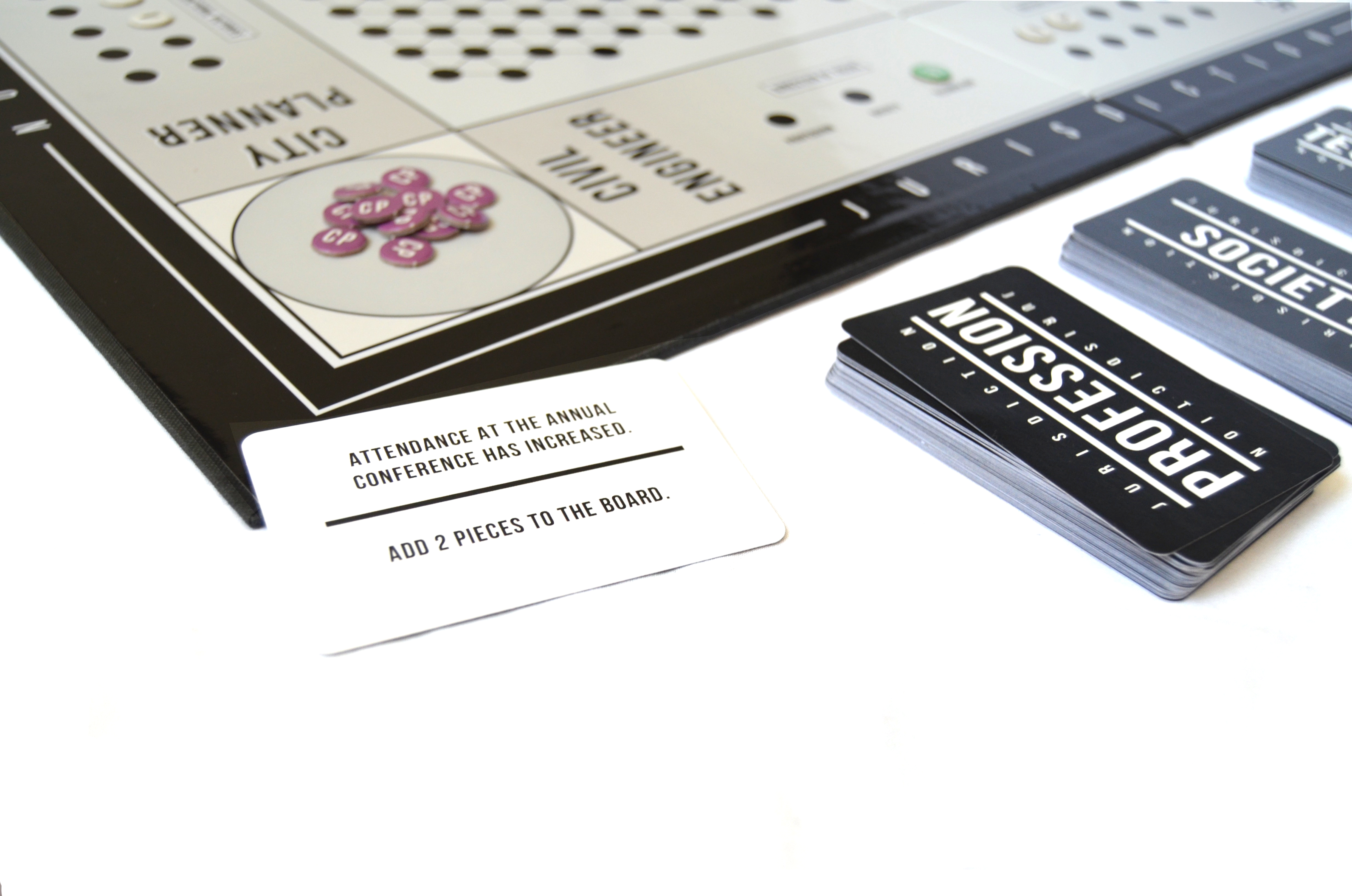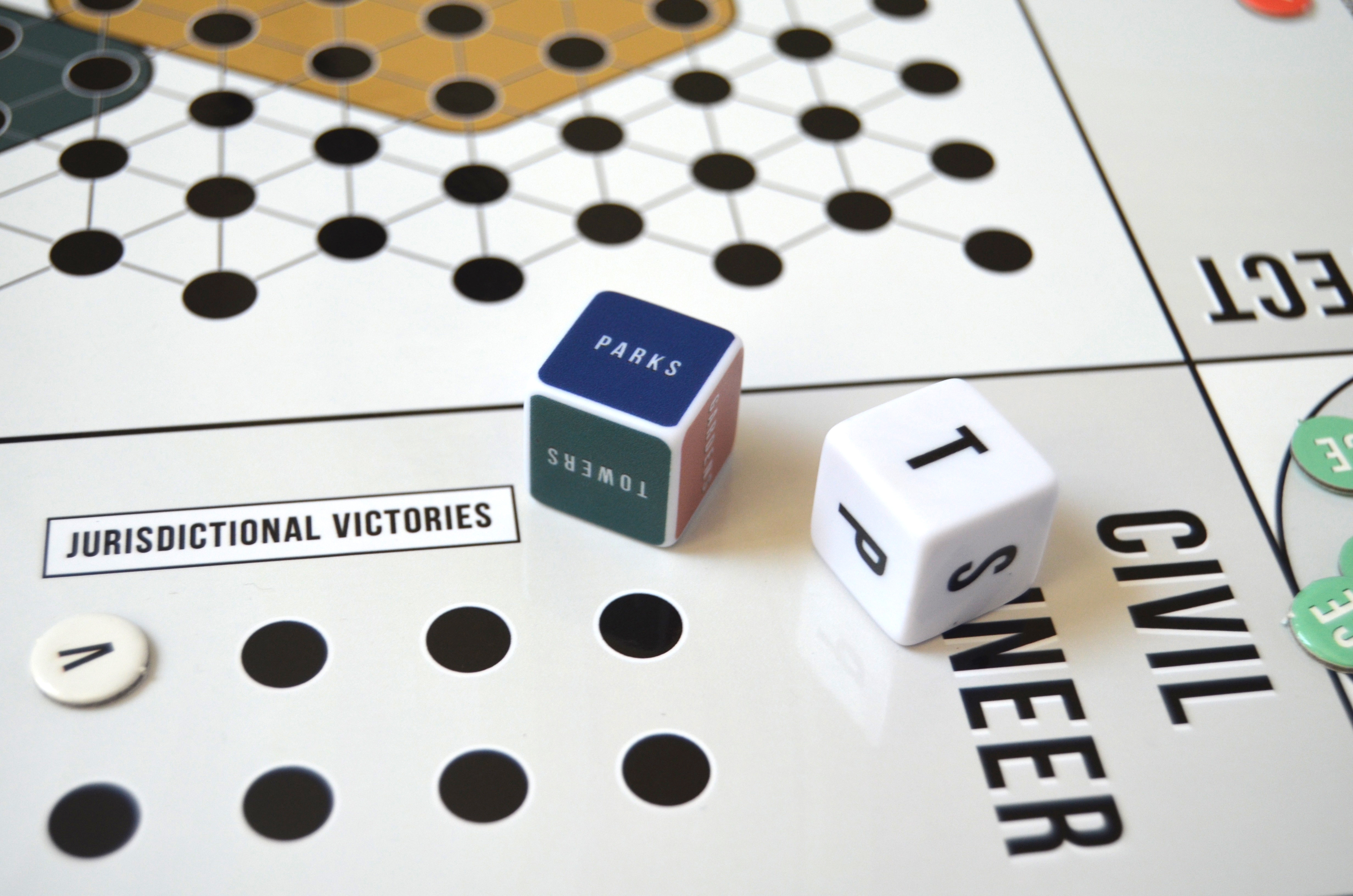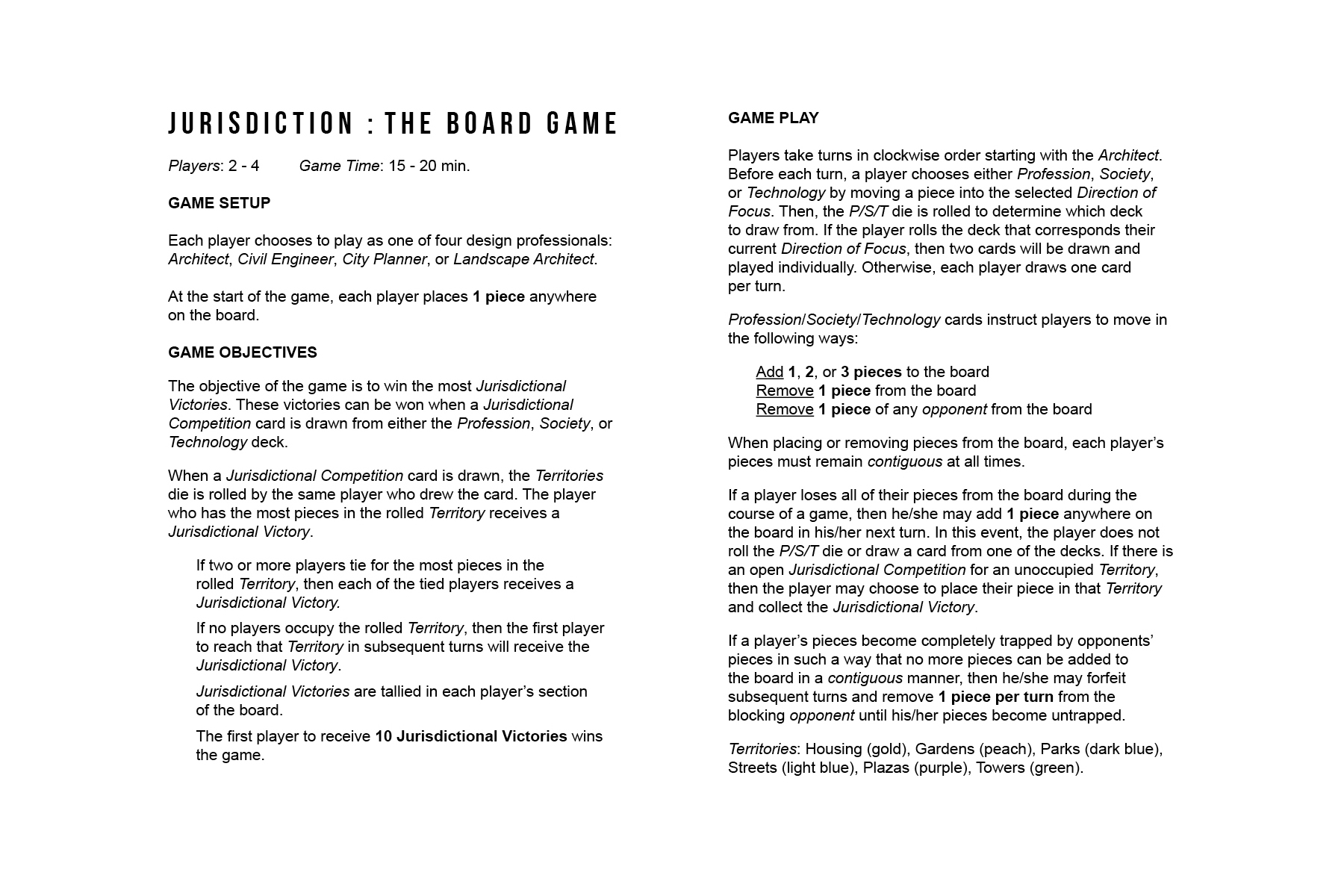 Most histories of architecture are written as if the disciplines of civil engineering, landscape architecture, and city planning simply do not exist. Within these texts, architects are portrayed as versatile heroes who not only design buildings, but also cities, infrastructures, and landscapes. Rarely is any serious attention devoted to the interactions between architects and their counterparts in allied disciplines. Recent sociological research, however, suggests that professions do not develop independently, but are instead shaped by jurisdictional conflicts with competitors. Jurisdiction: The Board Game presents a playable model of inter-professional competition. Structured around six territories (housing, towers, parks, plazas, streets, and gardens), the game requires players to adopt a profession and reconfigure its disciplinary boundaries in order to compete for jurisdictional victories. Such competition is guided by three decks of cards, which highlight the impact of professional, societal, and technological factors. Beyond offering a novel approach to architectural historiography, Jurisdiction: The Board Game reveals the ways in which individual professions leverage their expertise as an instrument of power within larger society.